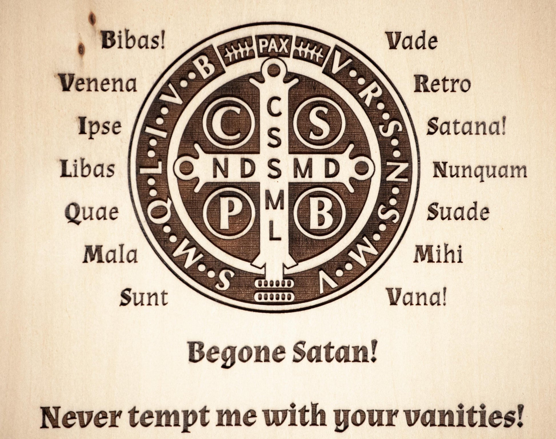 Add a reminder of our Faith to your home or work area with this rustic wood wall art. Measuring approximately 10" x 13" with a rustic bark edge, and beautifully engraved with an image of the Saint Benedict Medal paired with a comprehensive explanation and translation of the prayers. Complete with a sawtooth hanger on the back, ready to hang, this piece could be the focal point of your home! Proudly engraved by a small business in the USA, a perfect gift for housewarmings, weddings, any occasion celebrating faith and family traditions, or addition to your family's daily Catholic living.