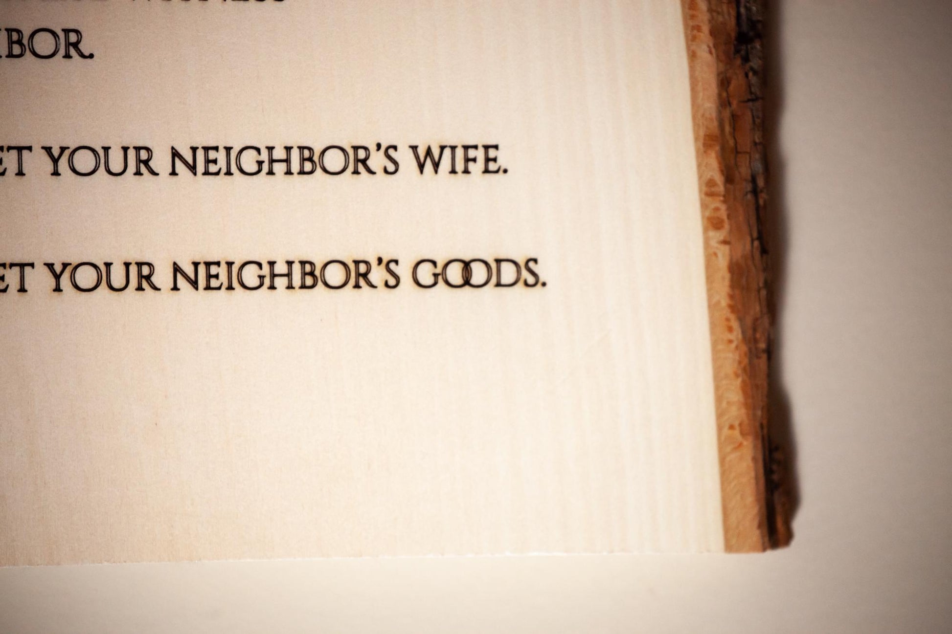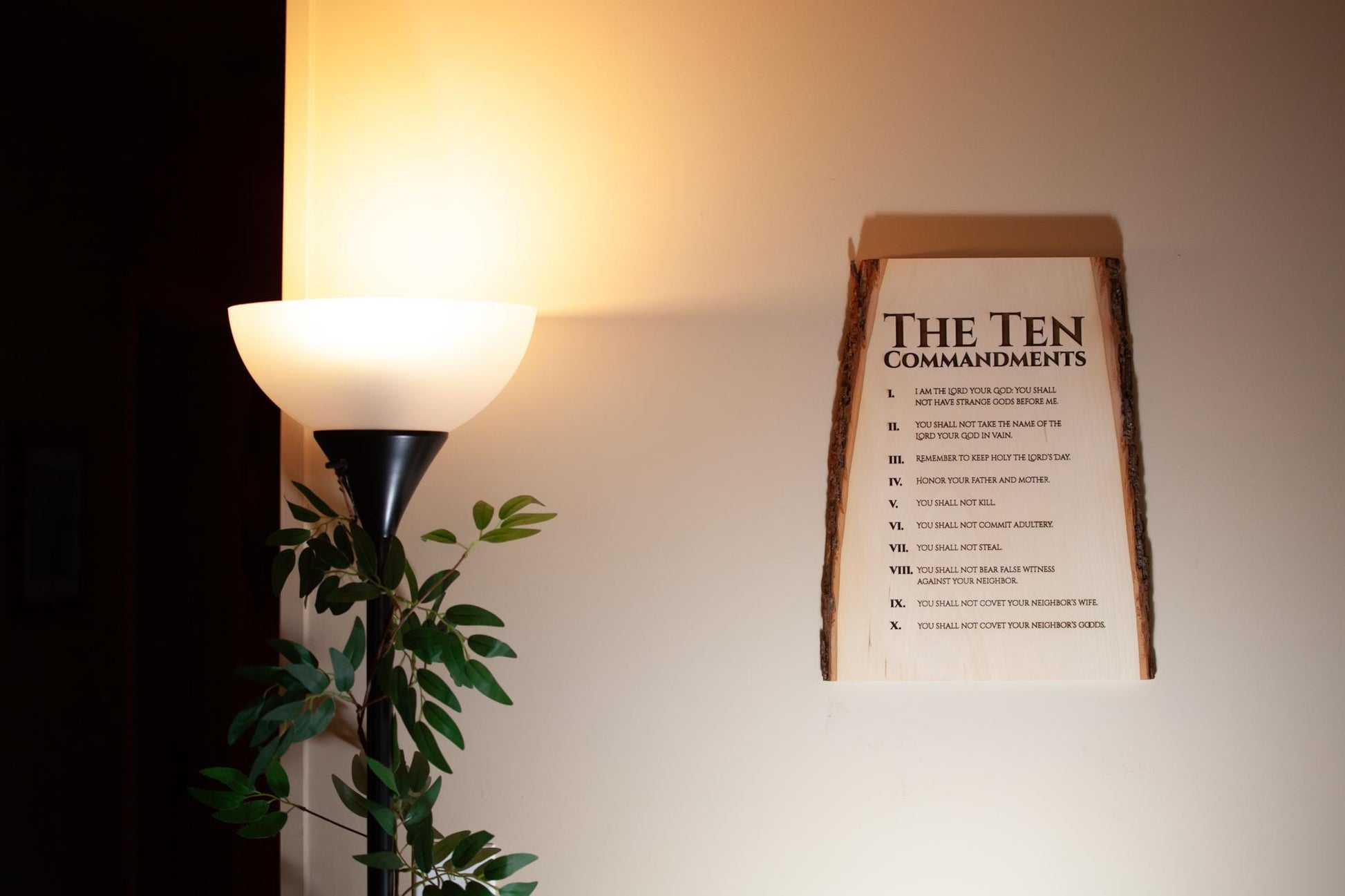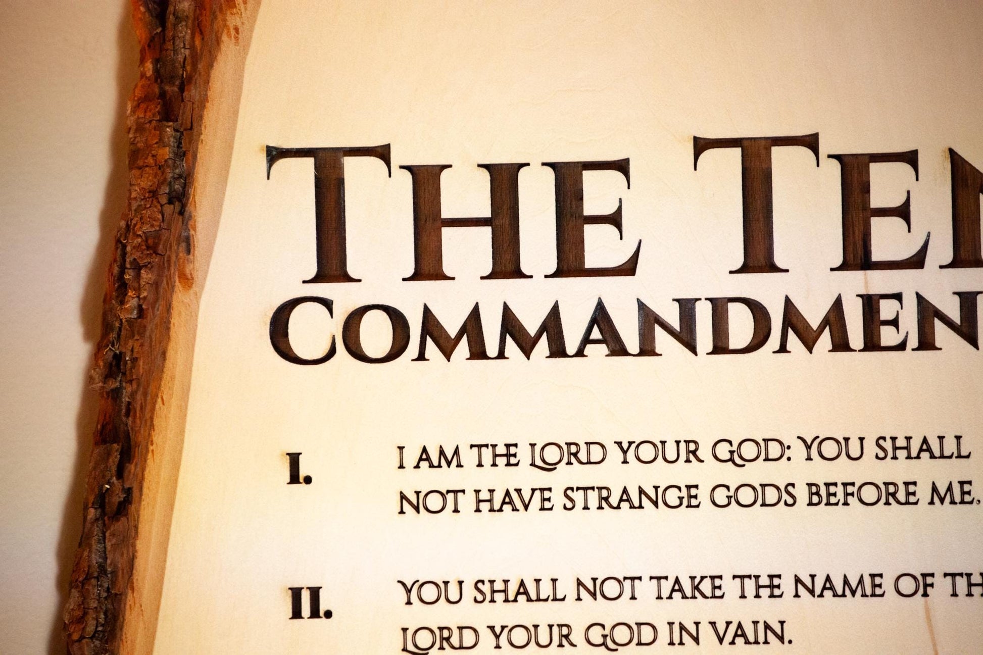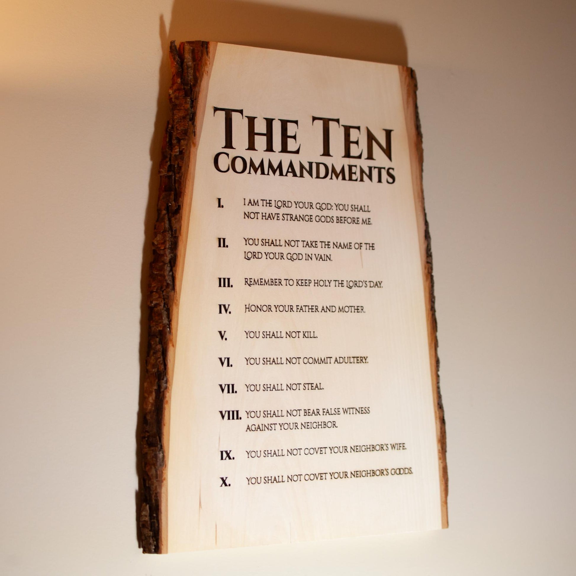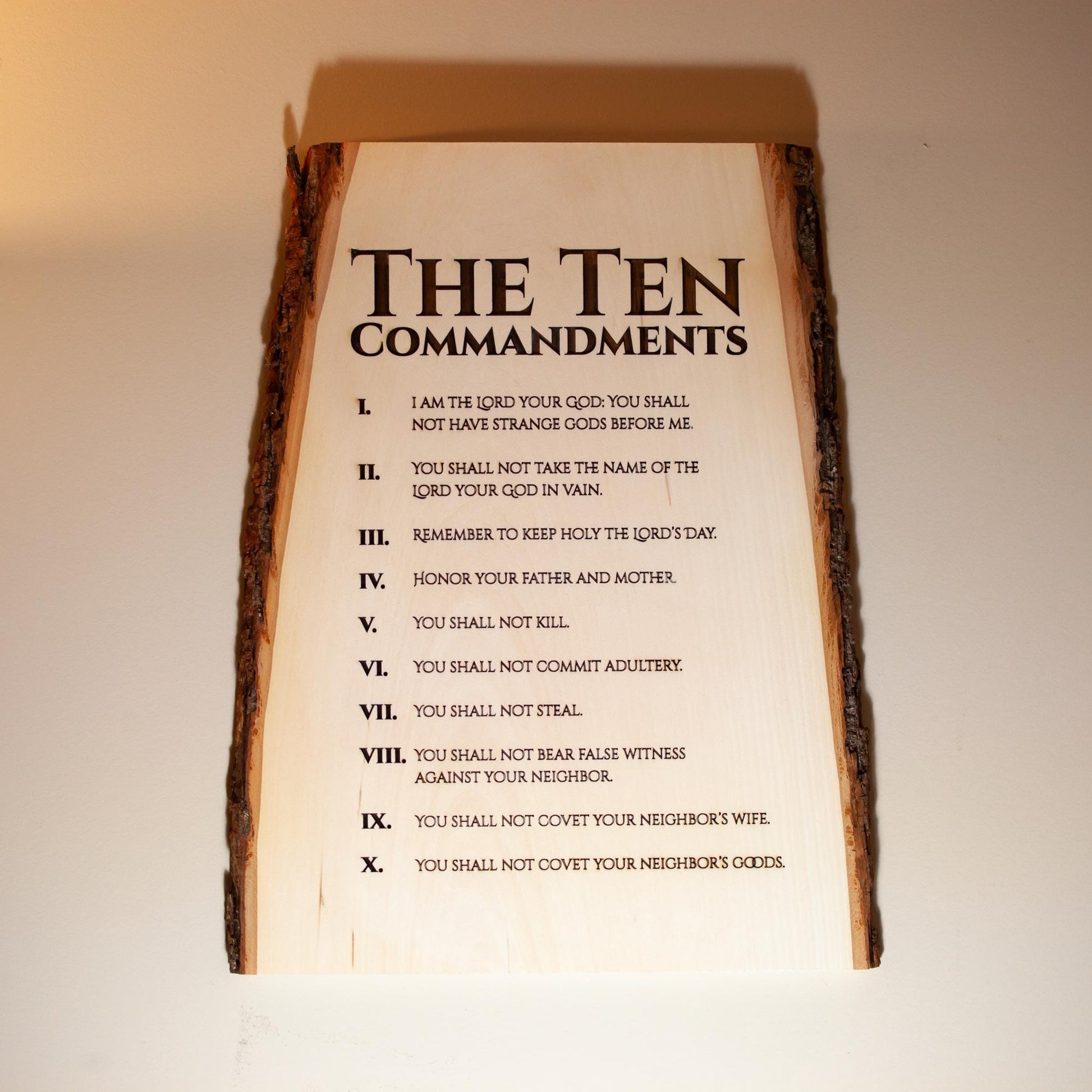 The Ten Commandments, 11" x 16" Laser-Engraved Wood Wall Art with Bark Edge, Engraved in the USA, Catholic Living