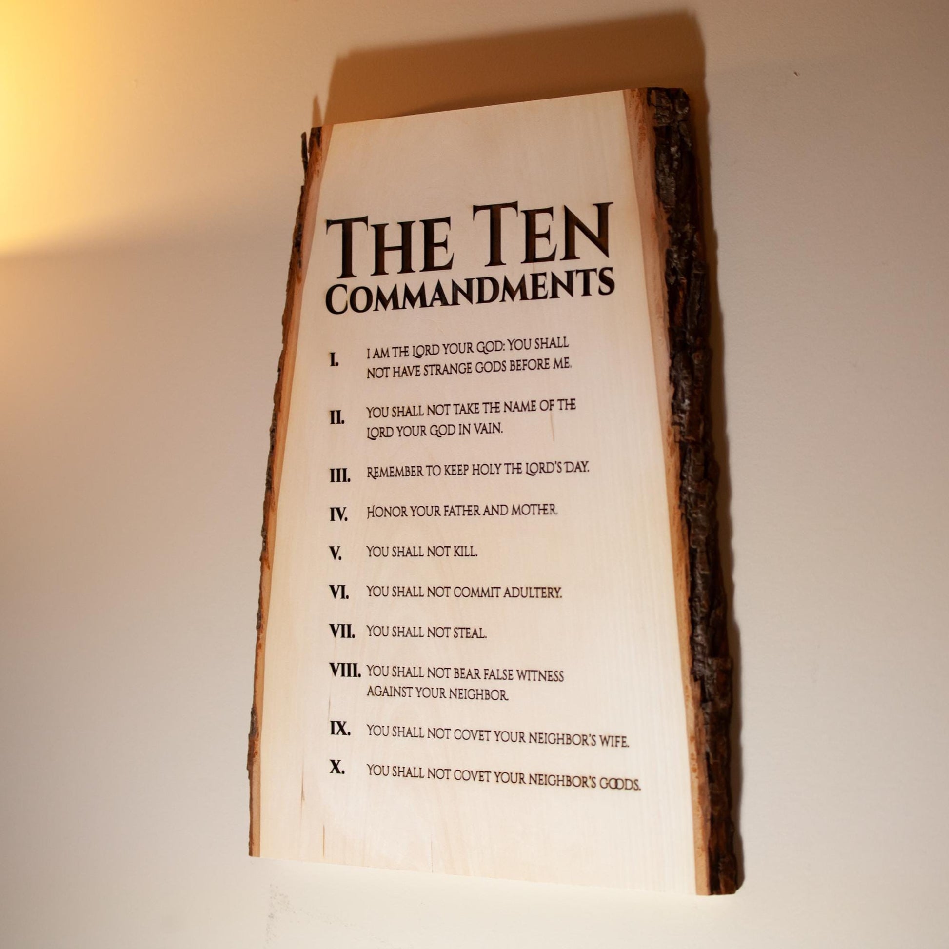 Add a reminder of our Faith to your home or work area with this rustic wood wall art. Measuring approximately 11" x 16" and 11/16" thick with a rustic bark edge, and beautifully engraved with the Ten Commandments, it serves as a thoughtful reminder of our faith. Complete with a sawtooth hanger on the back, ready to hang, this piece could be the focal point of your home! Proudly engraved by a small business in the USA, a perfect gift for housewarmings, weddings, any occasion celebrating faith and family traditions, or addition to your family's daily Catholic living.